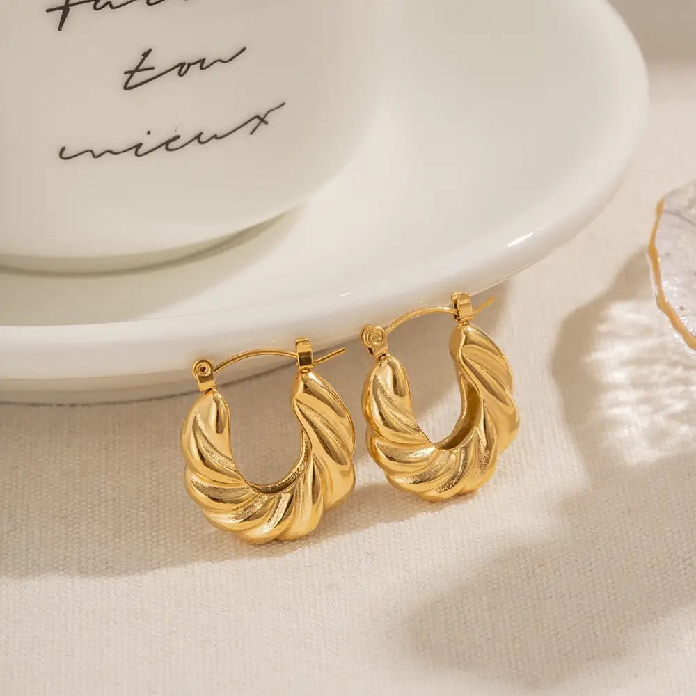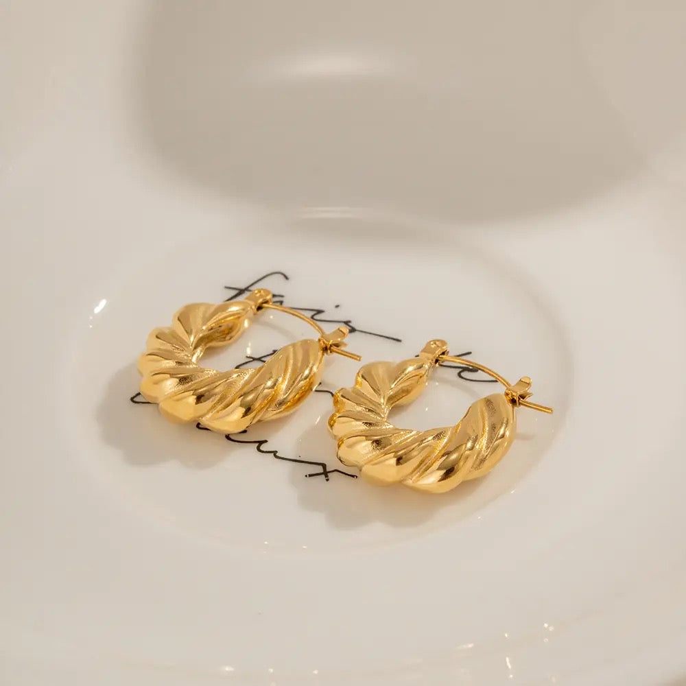 Estos aros torcidos son el accesorio ideal para complementar cualquier outfit, ya sea casual o formal. Un toque de elegancia que no puede faltar en tu colección de joyería.