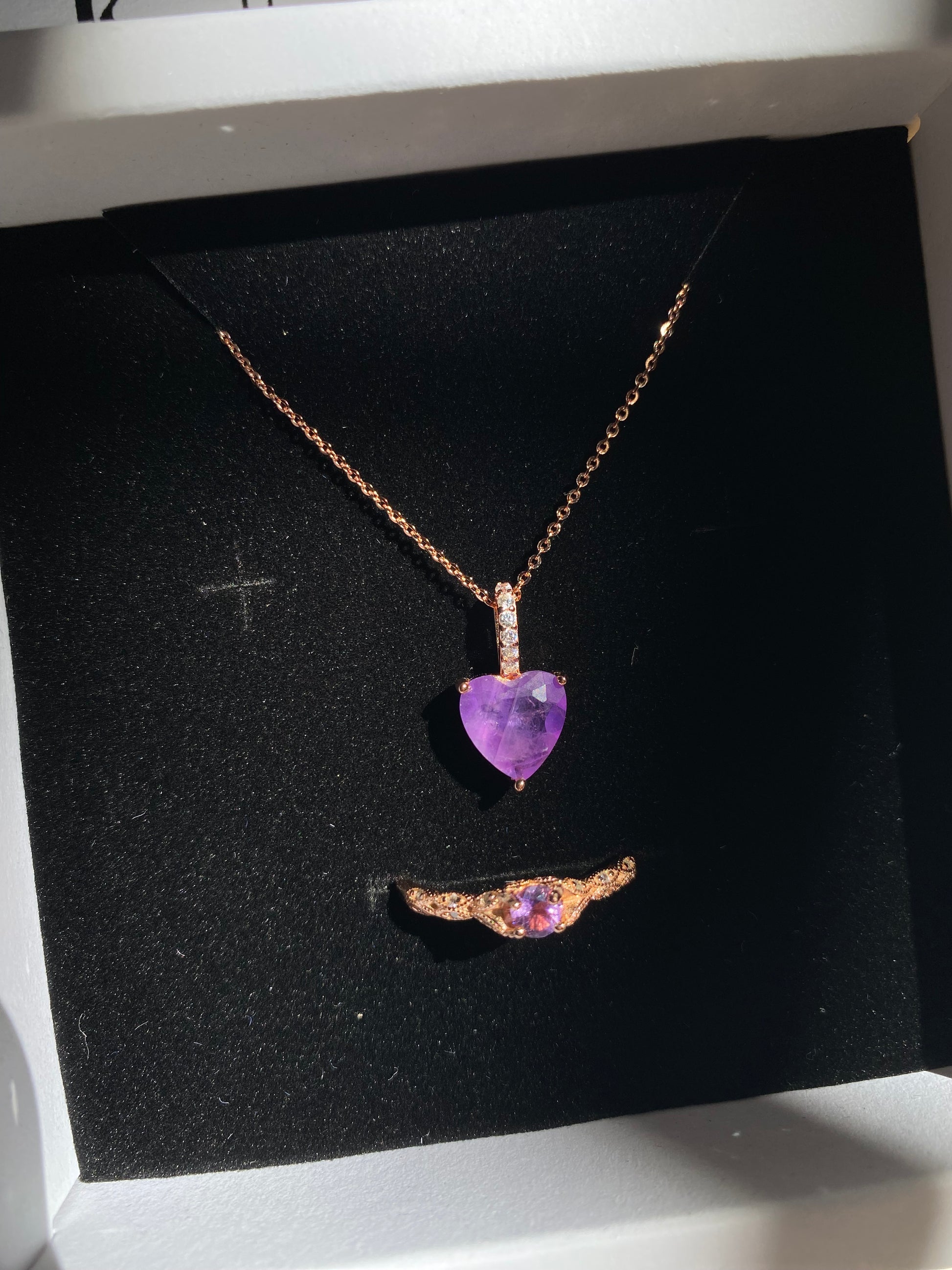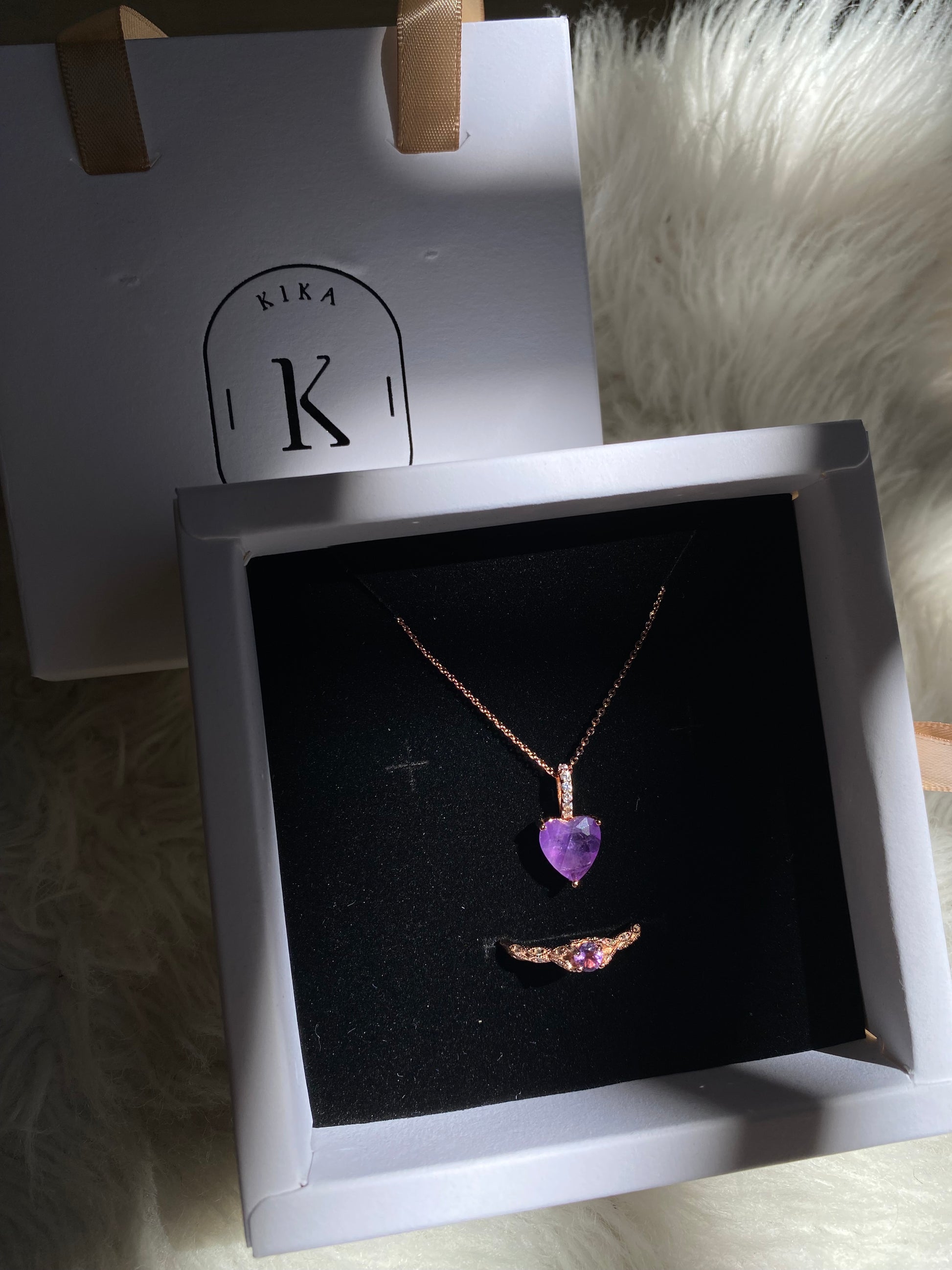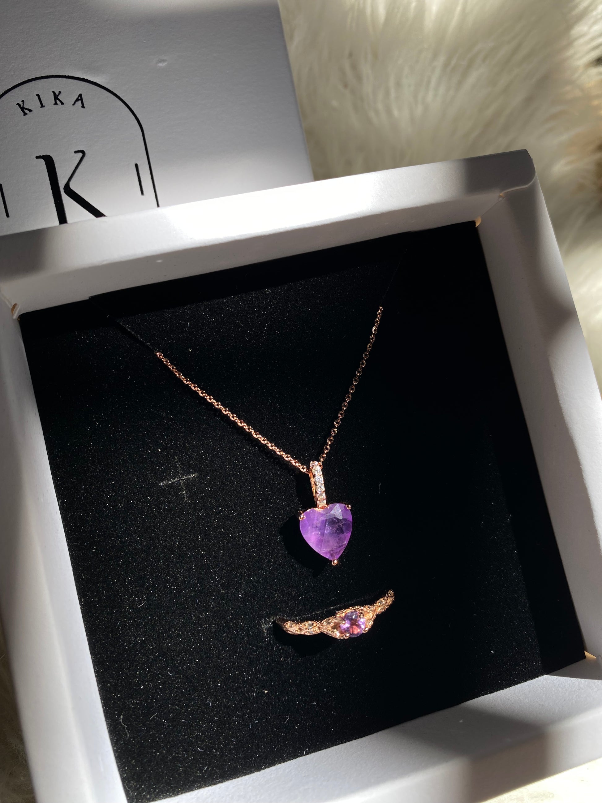 Let your spirit shine with our Amethyst Heart Set. This enchanting set features a delicate necklace with a natural amethyst heart surrounded by sparkling zirconias, paired with an elegant ring showcasing a small round amethyst and shimmering zirconias. Crafted in 925 sterling silver plated in rose gold, it’s the perfect blend of beauty and timeless love.