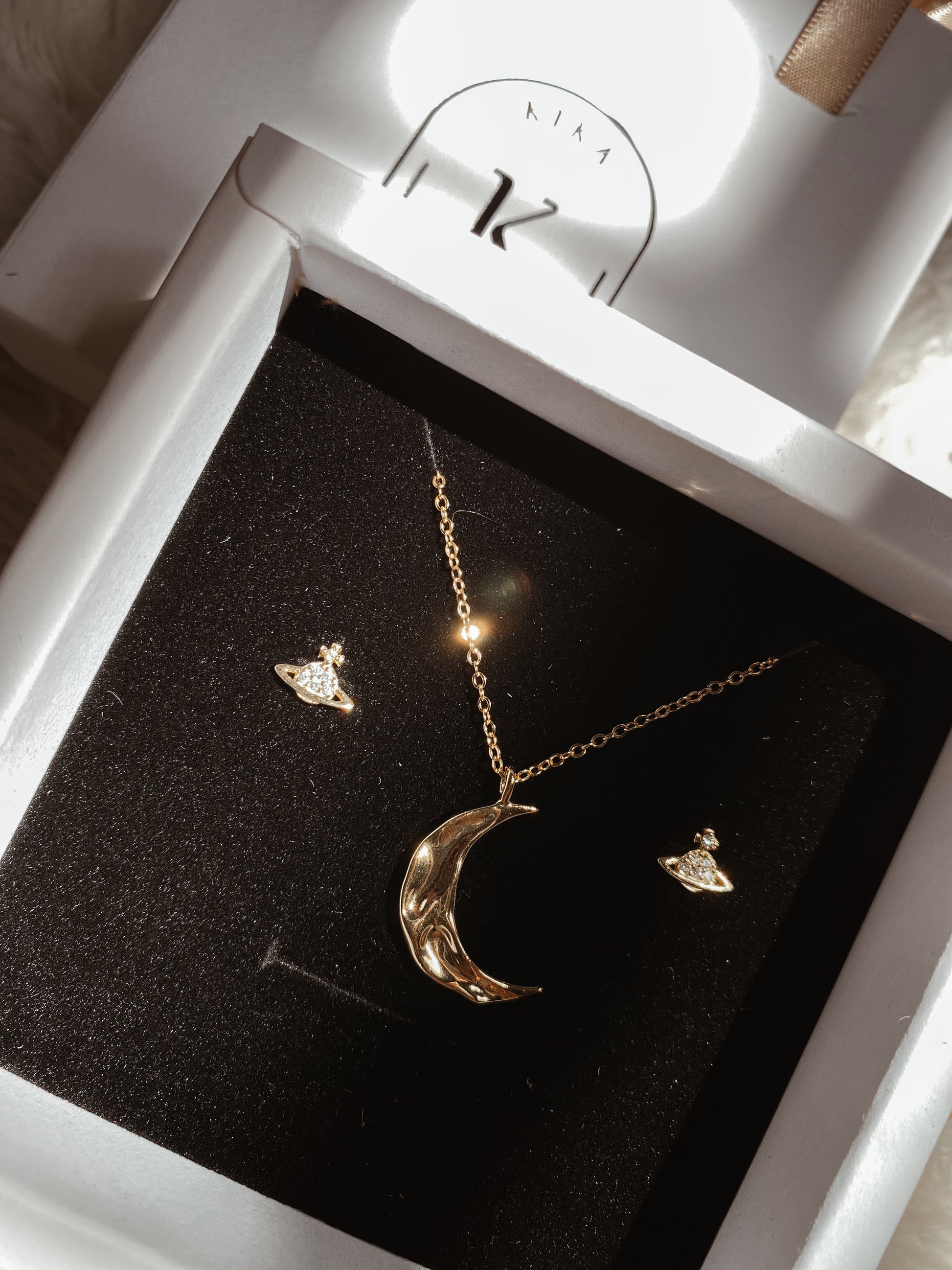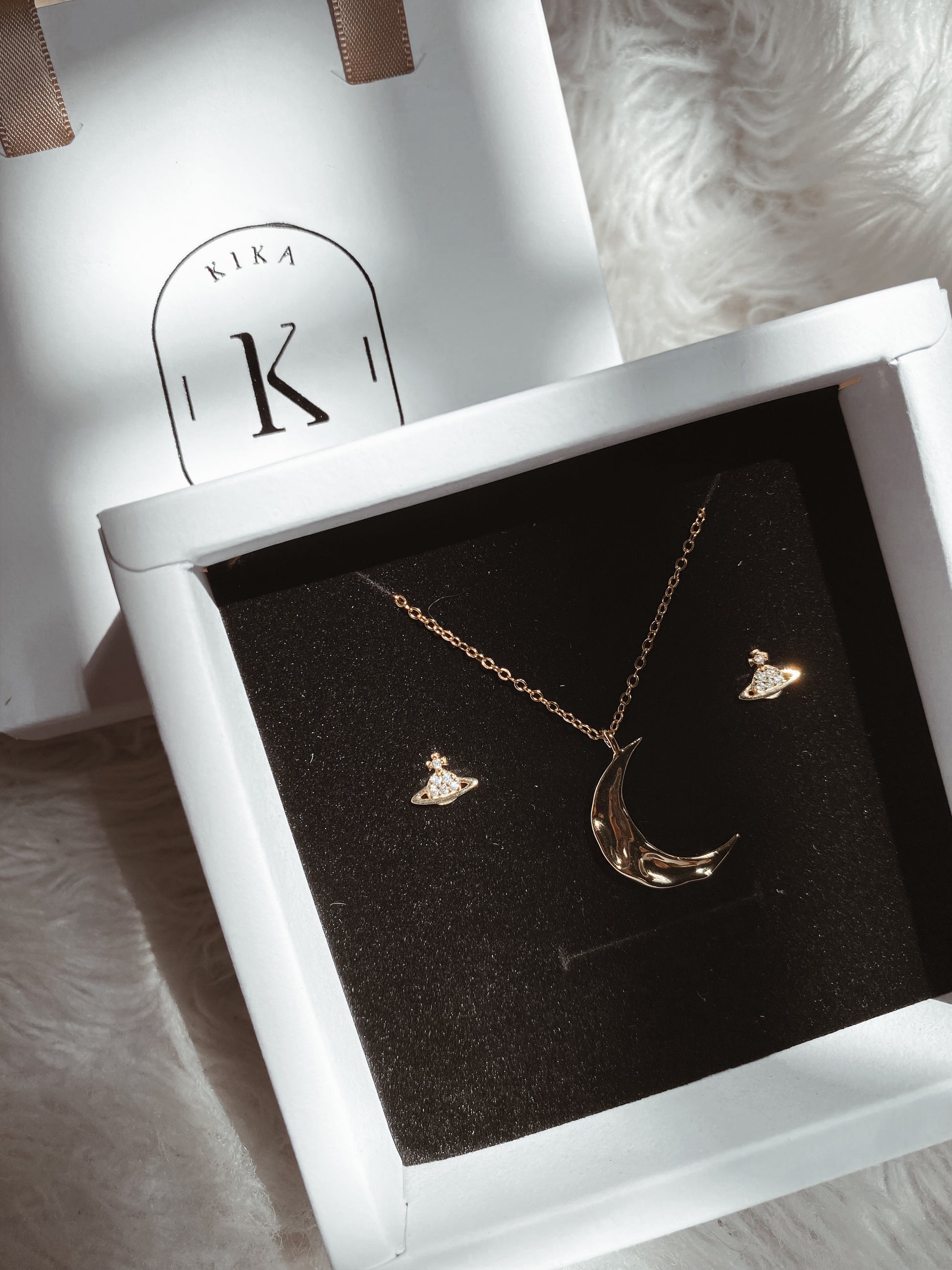 Abraza la magia del universo con nuestro Cosmic Dreams Set. Con delicados aretitos en forma de Saturno y una elegante cadena con luna, este set captura la belleza de las estrellas e invita a brillar con un encanto celestial.