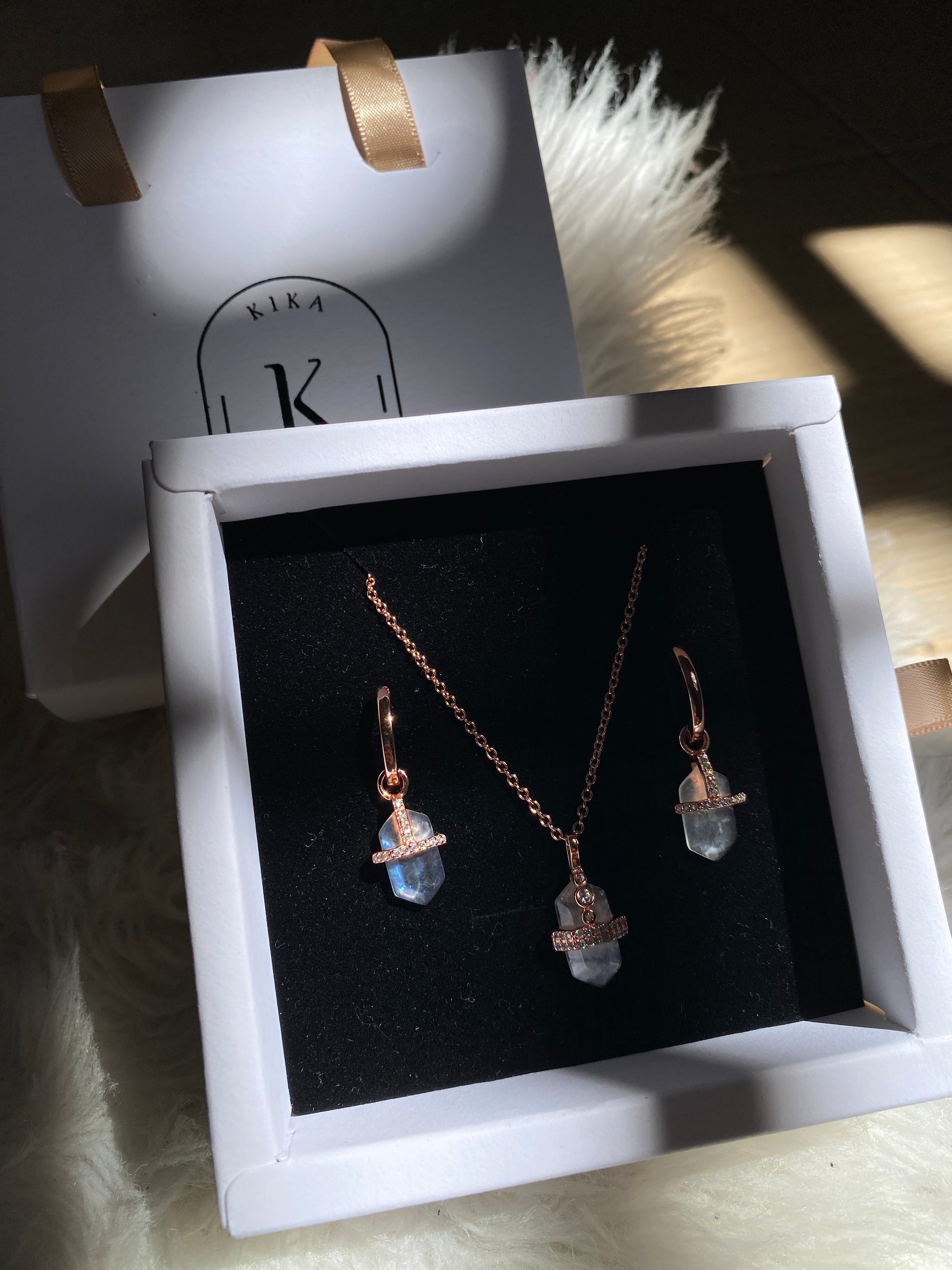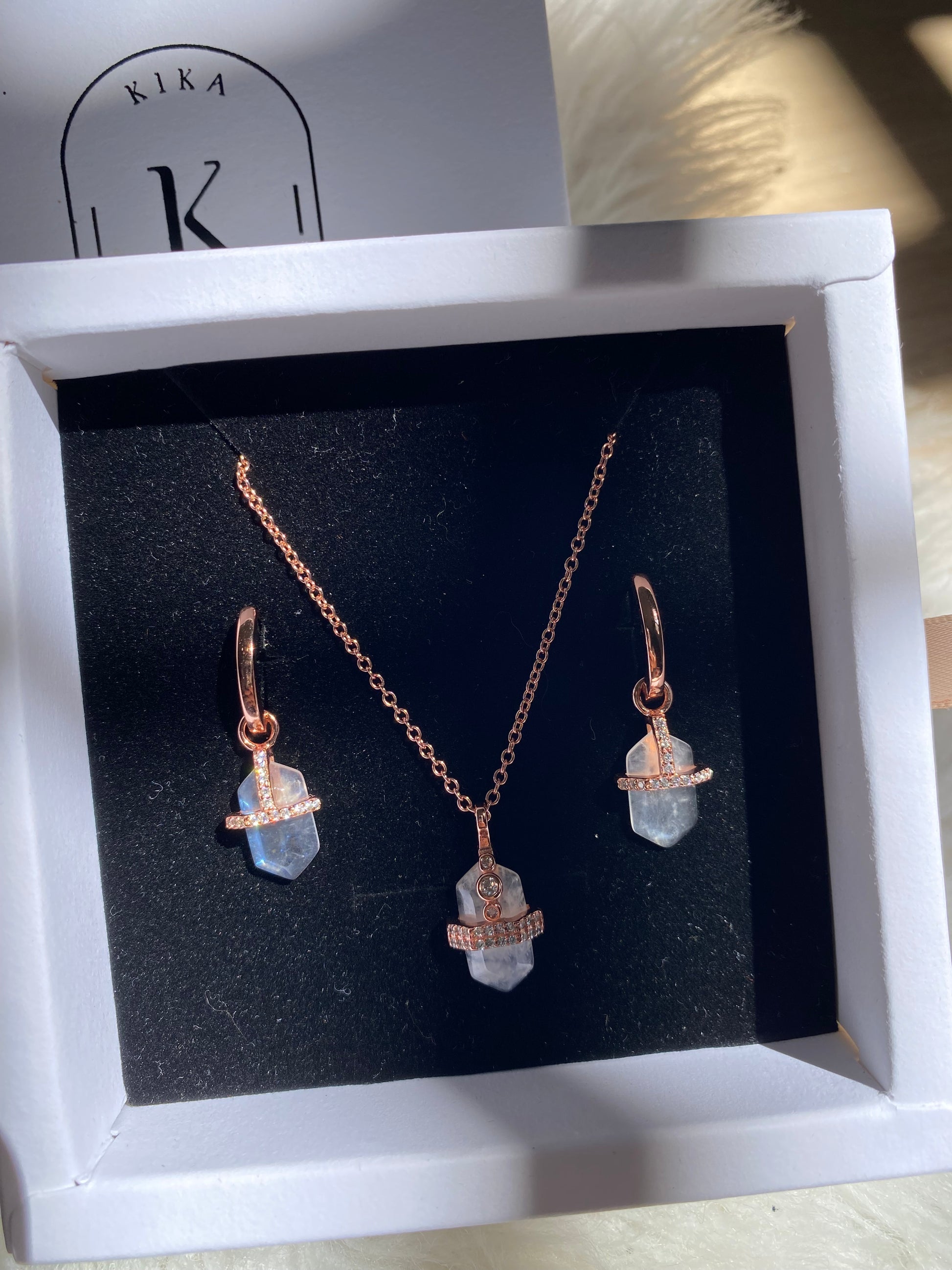 Our Crystal Moon set blends the purity of natural stone with the delicate shine of rose gold plating. It includes a necklace and matching earrings designed to highlight the beauty and of moonstone — perfect for gifting or treating yourself with an elegant touch.