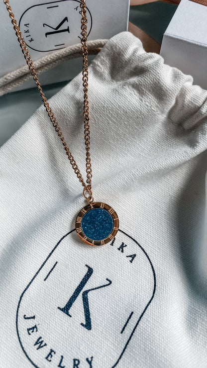 La Cadena Eterna Noir es una pieza sofisticada y atemporal que simboliza el paso del tiempo con elegancia. Su dije circular presenta números romanos grabados alrededor de un centro negro intenso, creando un contraste armonioso entre la modernidad y la tradición.
