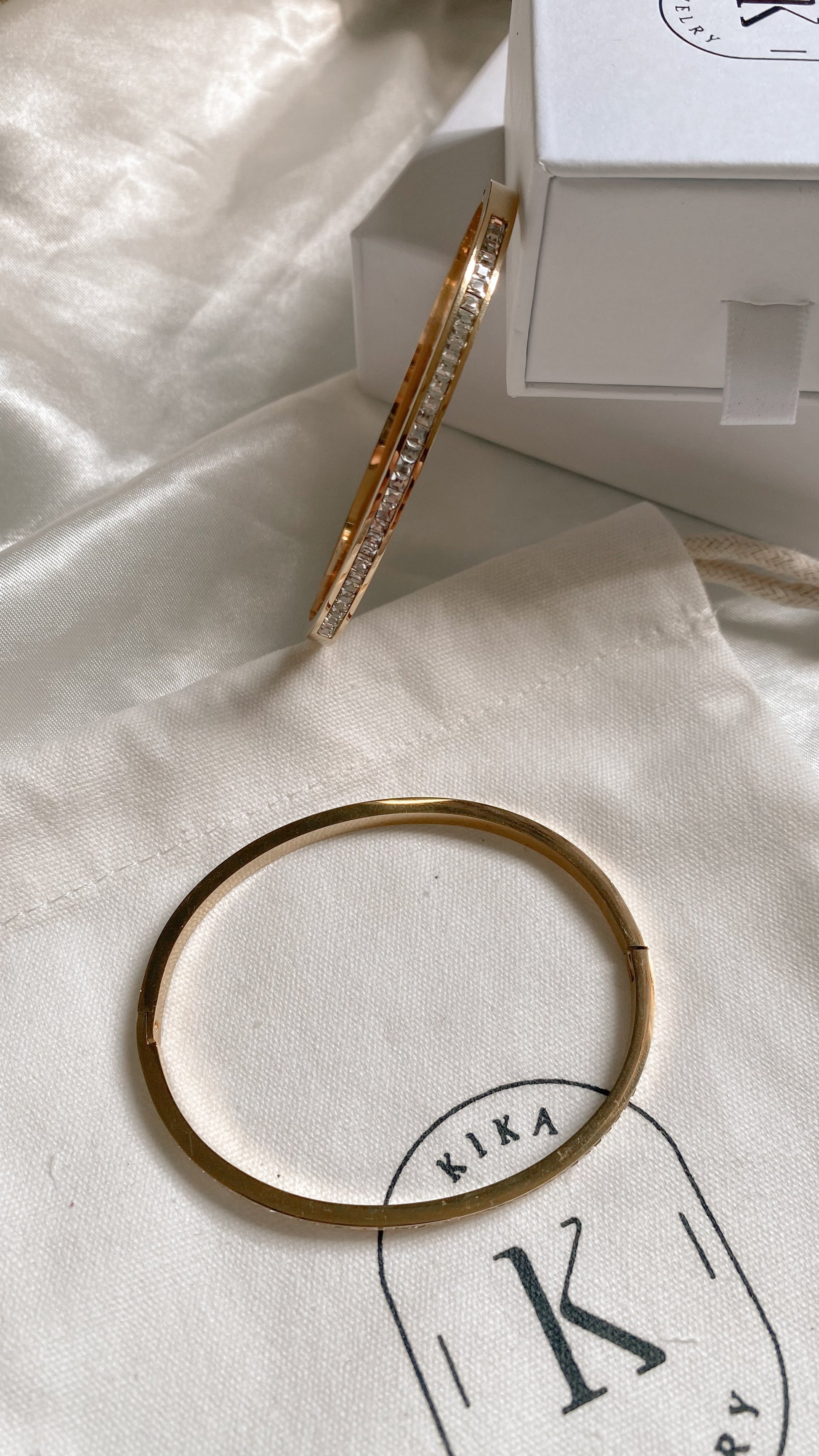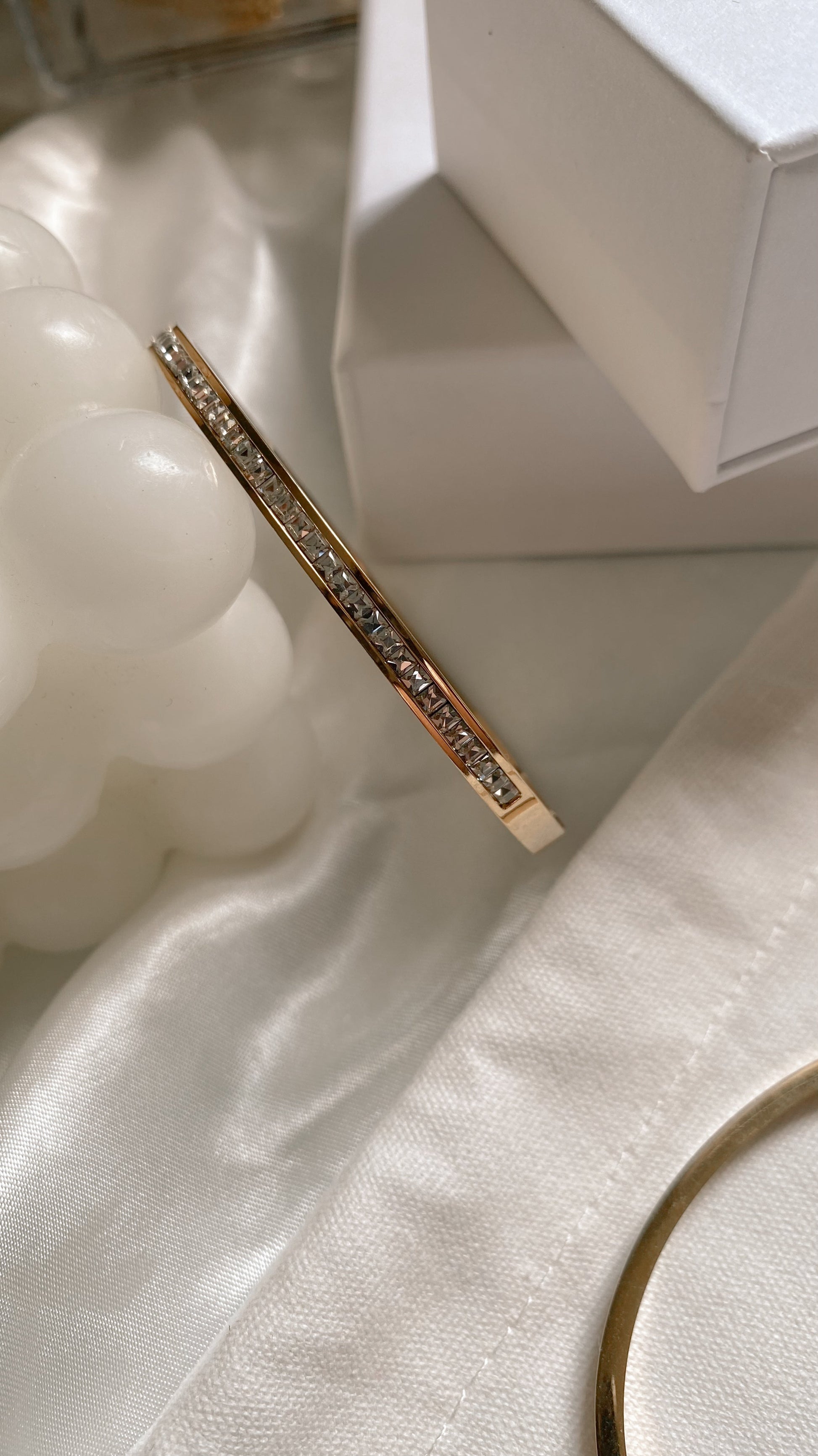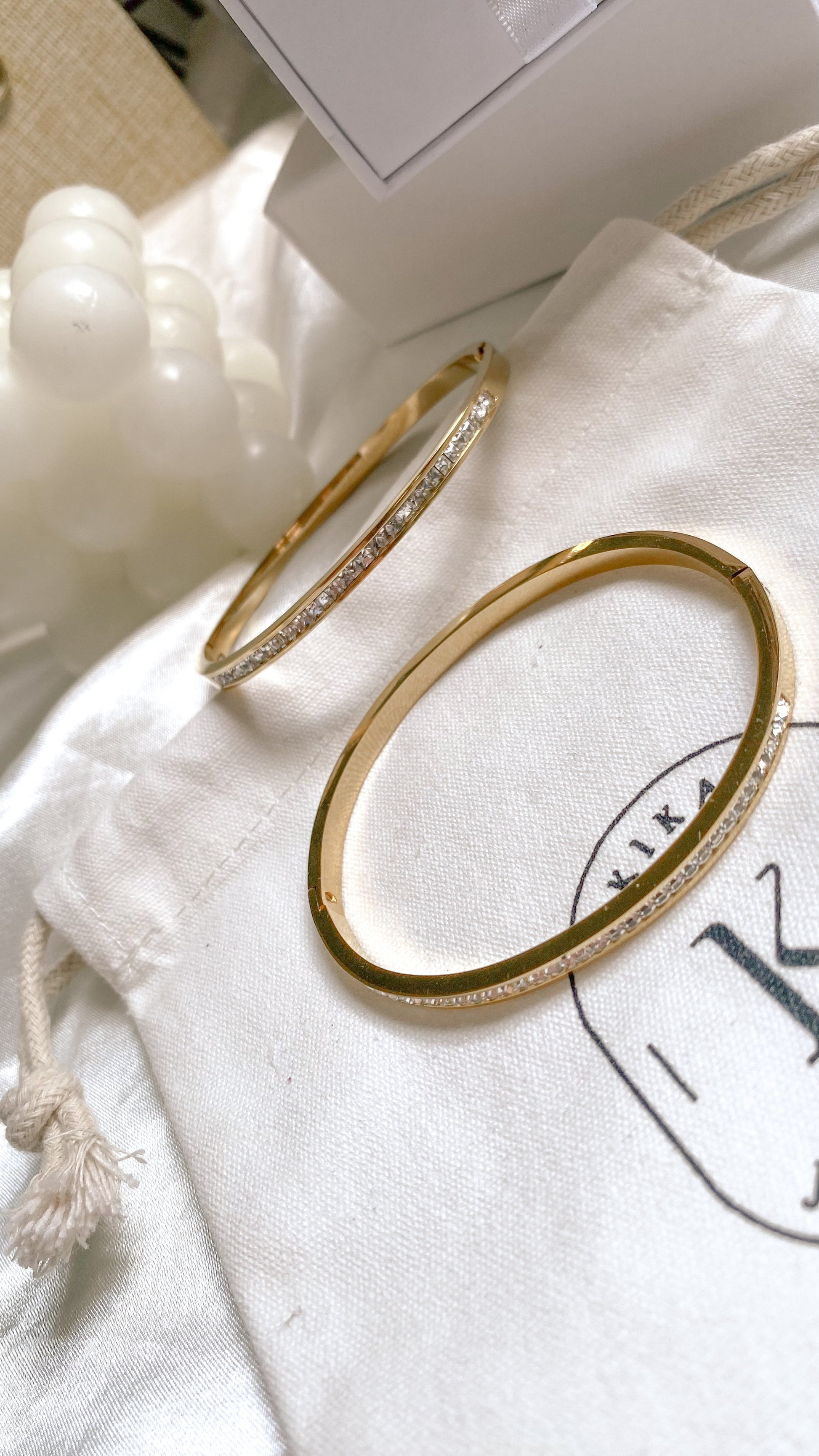 Este sofisticado brazalete, elaborado en titanio de alta calidad, destaca por su resistencia y ligereza. Su diseño minimalista con un acabado en tono dorado y cristales incrustados lo convierten en una joya versátil, ideal para cualquier ocasión.