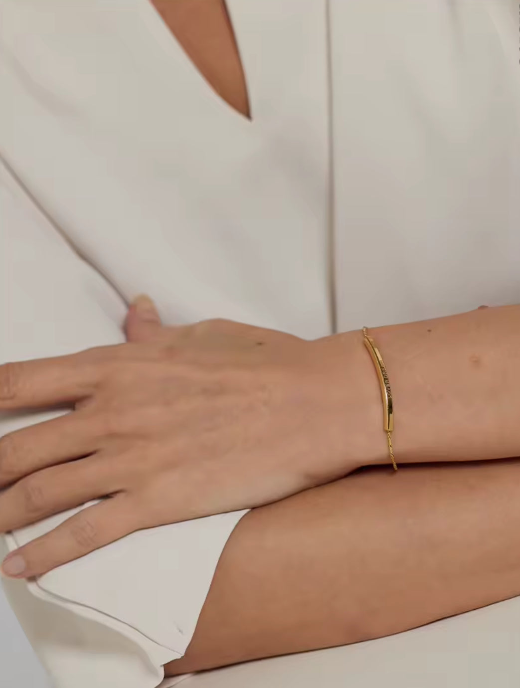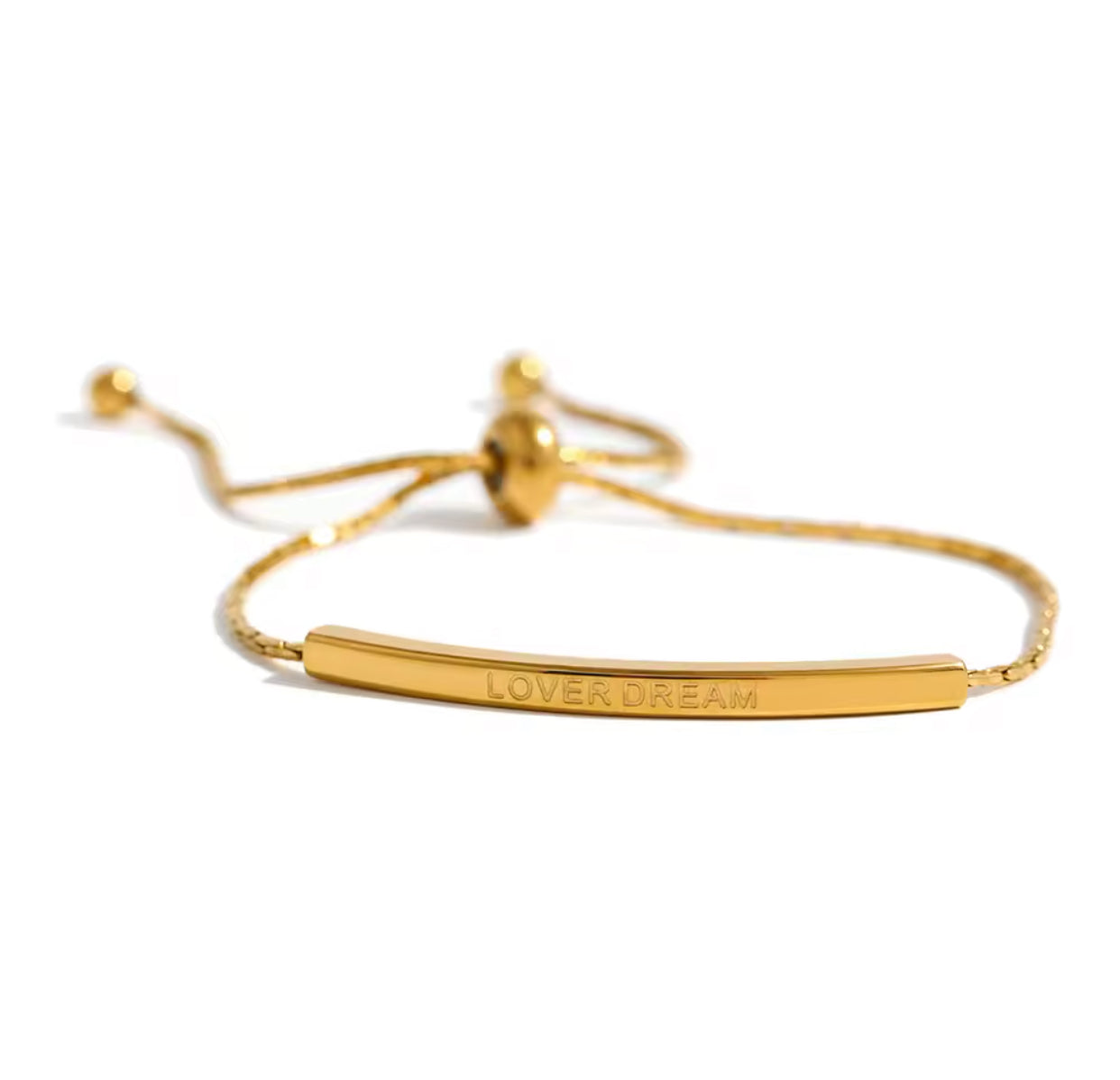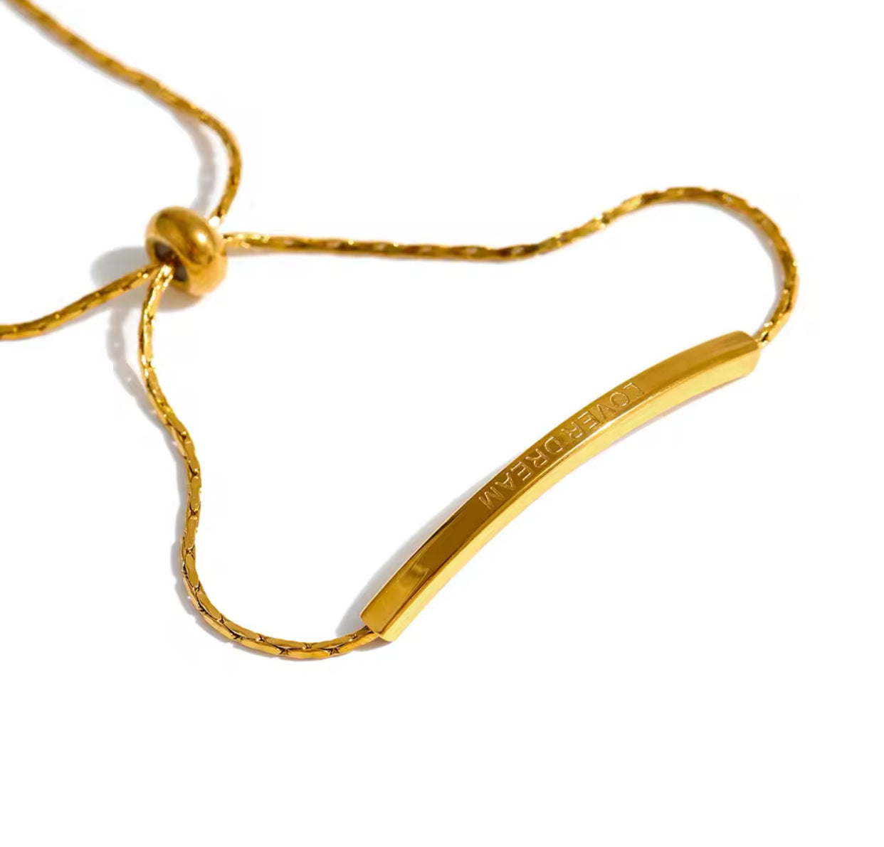 Un toque de inspiración para llevar siempre contigo. Este elegante brazalete en acero inoxidable 316L está grabado con las palabras “Love Dream”, un mensaje que evoca amor propio, esperanza y metas por cumplir. Su diseño dorado y minimalista lo convierte en una pieza versátil y significativa.