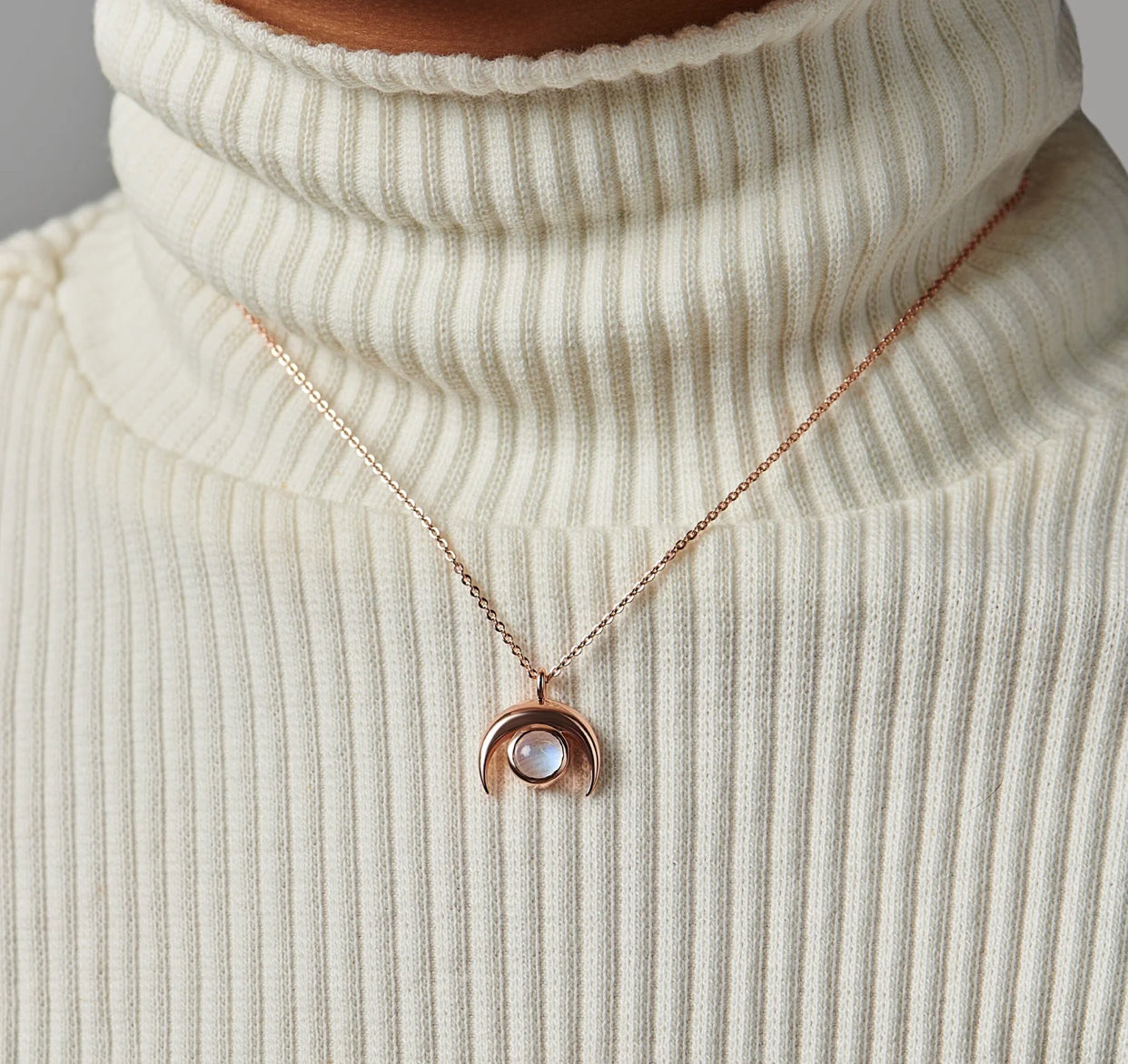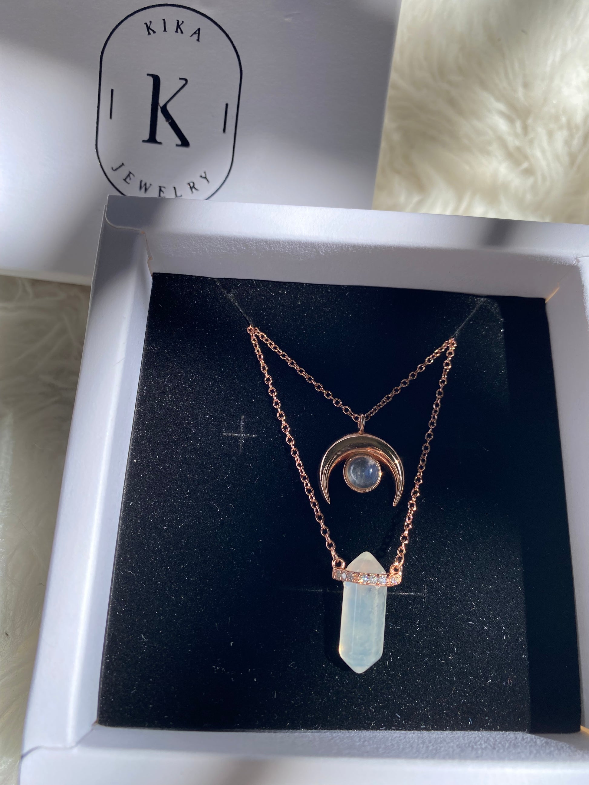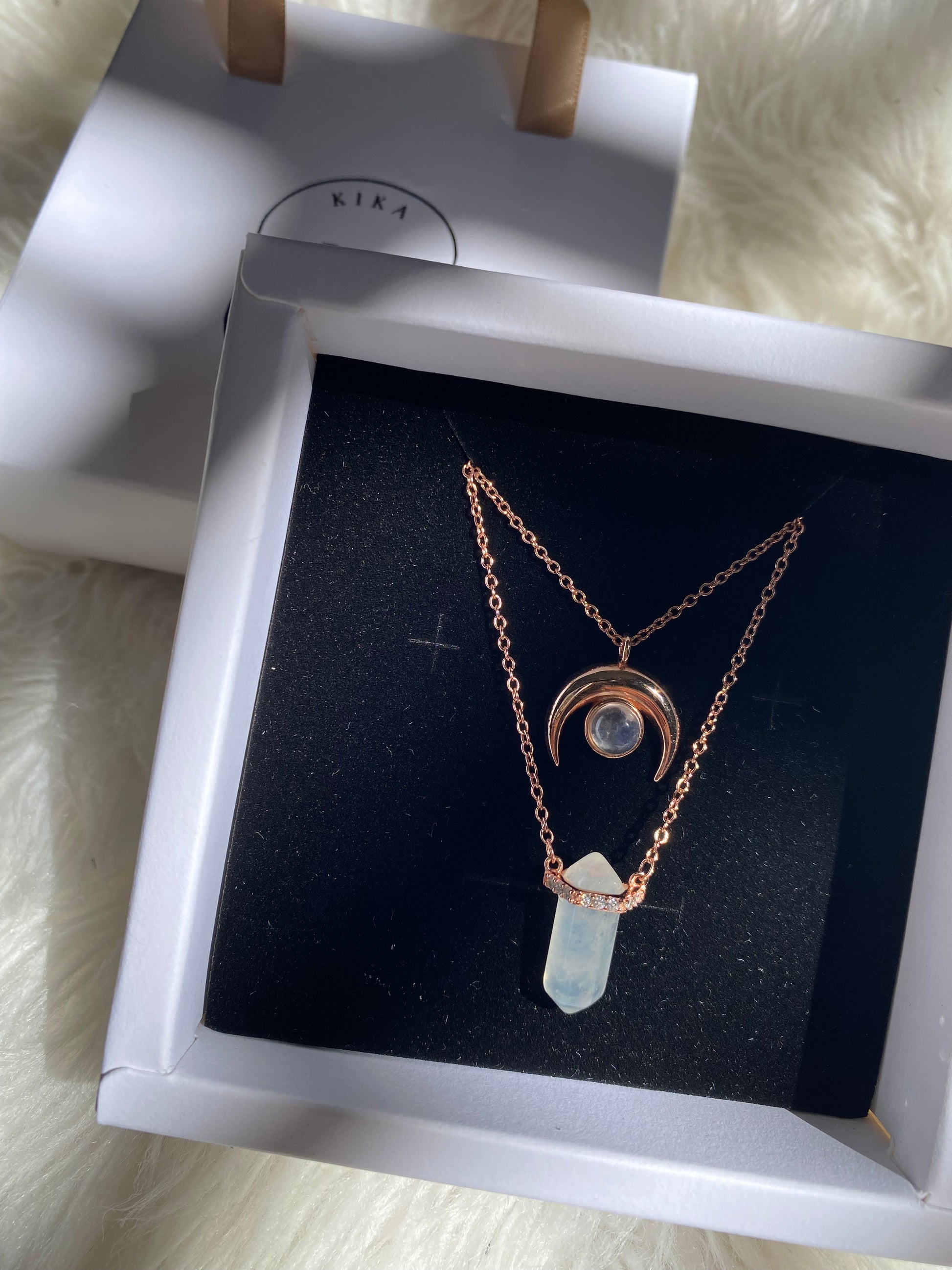 Let the moonlith guide you with our Lunar Set. Featuring a delicate half-moon necklace with a natural round moonstone set in 925 sterling silver plated in rose gold, and a second chain adorned with a moonstone pendulum and sparkling zirconias. A perfect blend of beauty and elegance.