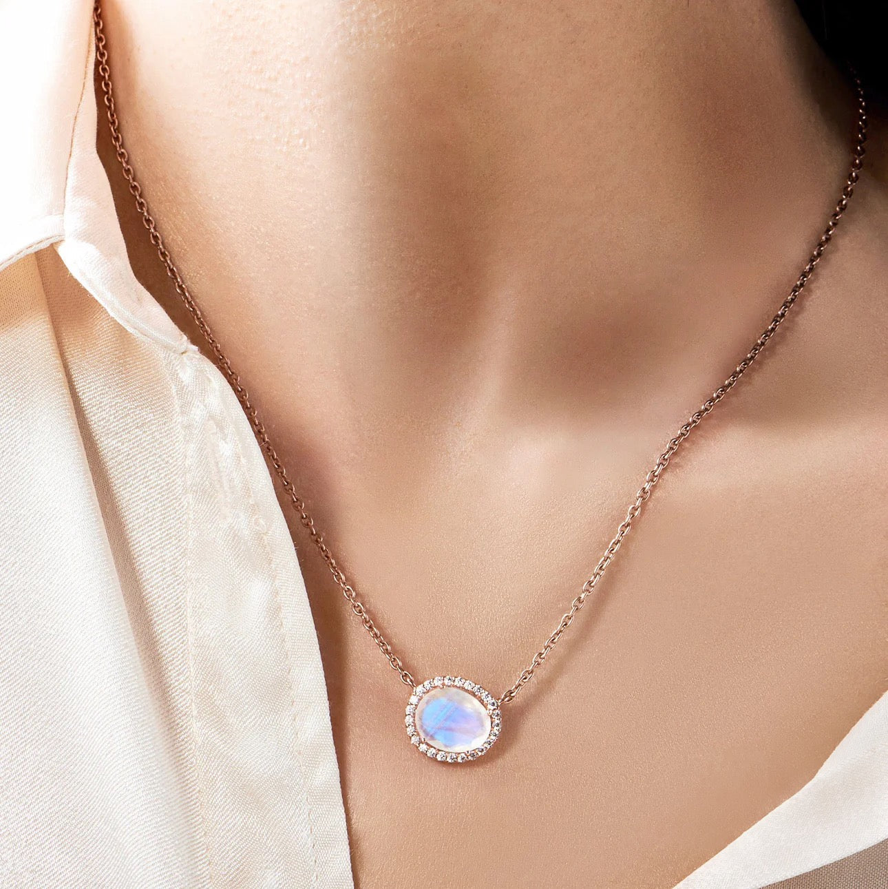 Una joya que refleja la perfección del diseño divino: este collar presenta una piedra lunar arcoíris auténtica, cuidadosamente engarzada en una forma ovalada brillante, rodeada por un halo de delicados circones blancos que evocan un estilo clásico y atemporal.