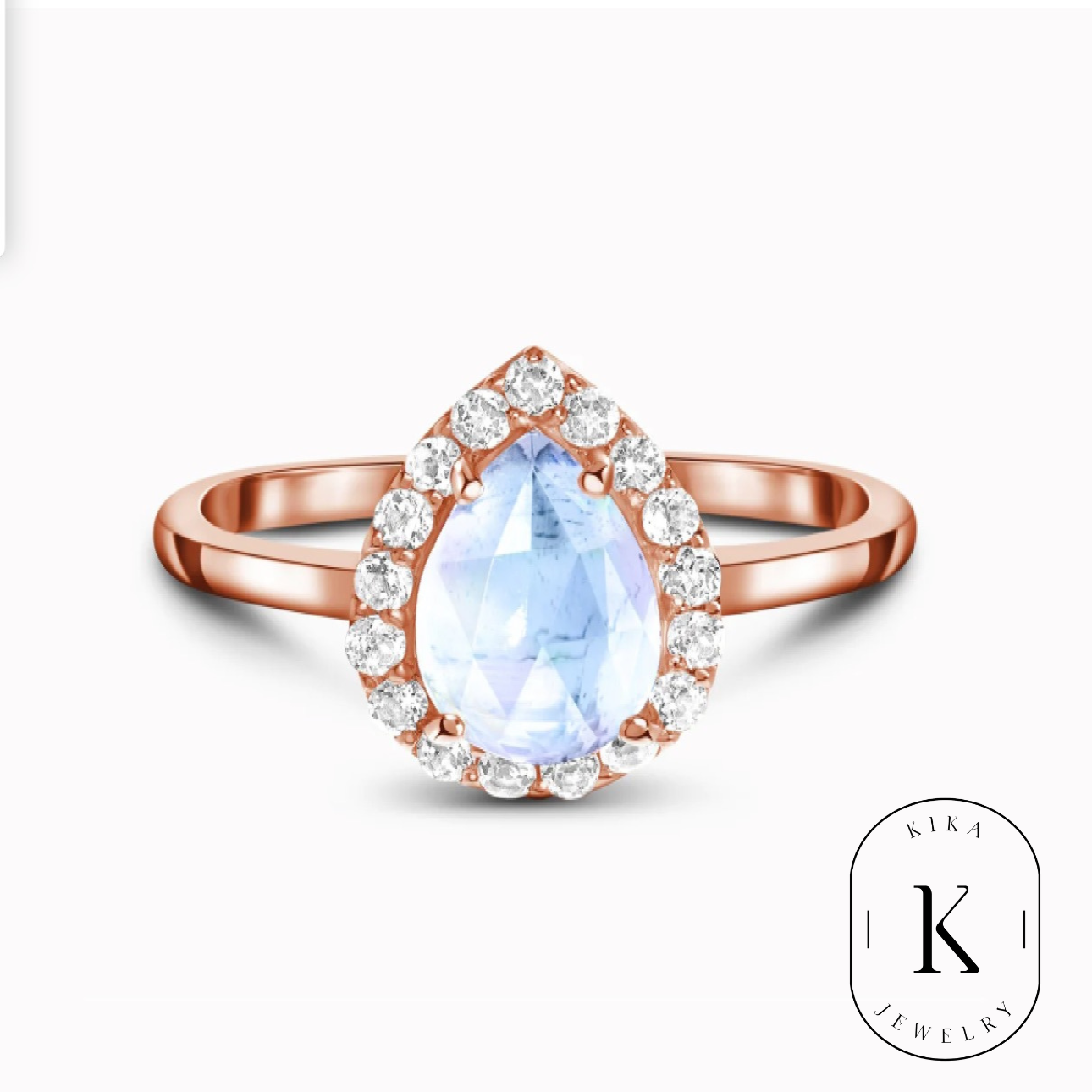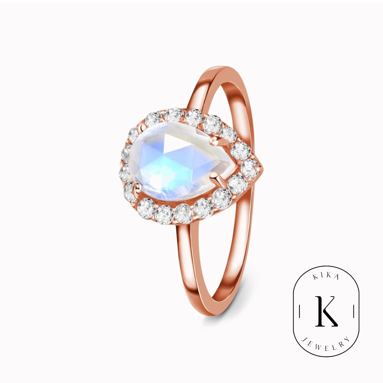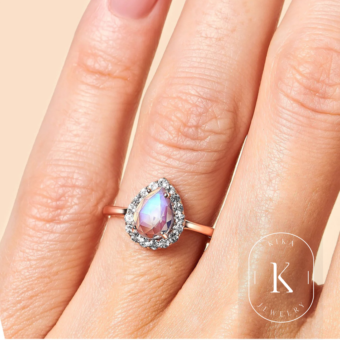 - Corte: Piedra lunar de corte rosa en forma de pera y zirconias blancas de corte brillante de forma redonda