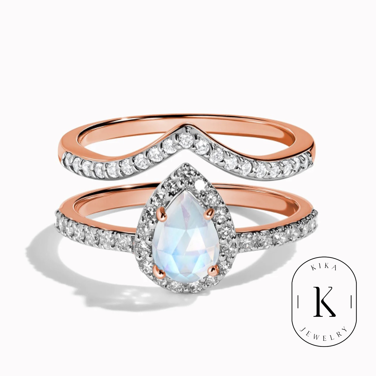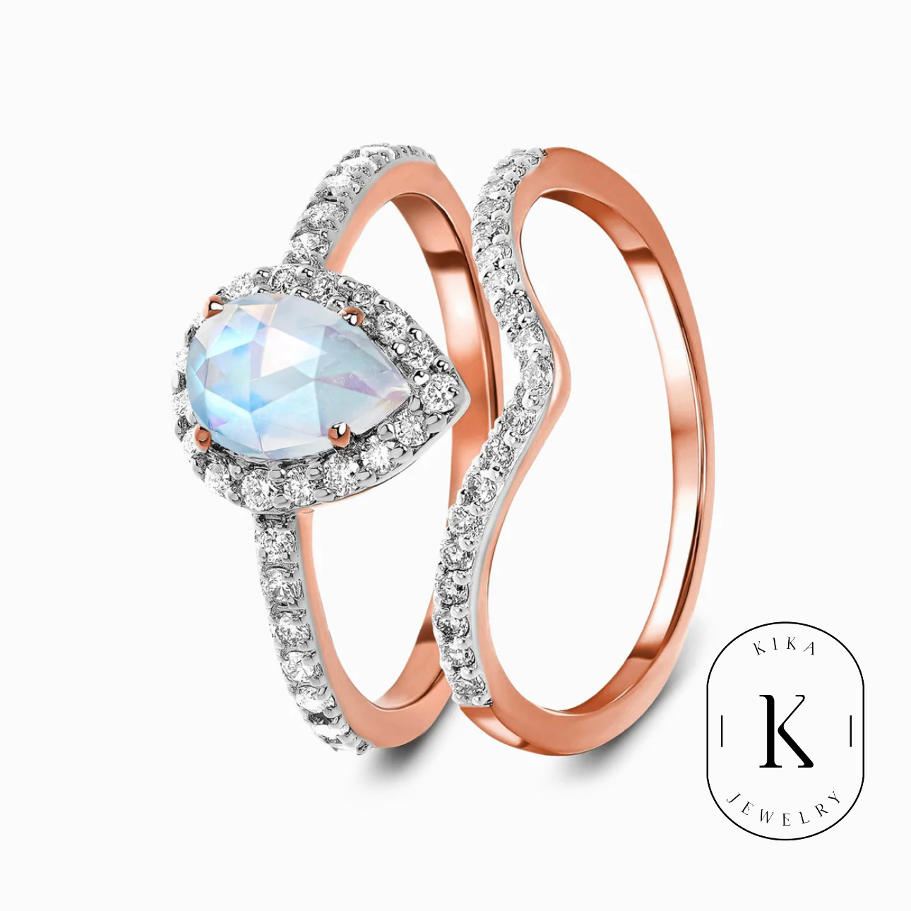 - Corte: Piedra lunar de corte rosa en forma de pera y topacio blanco de corte brillante de forma redonda