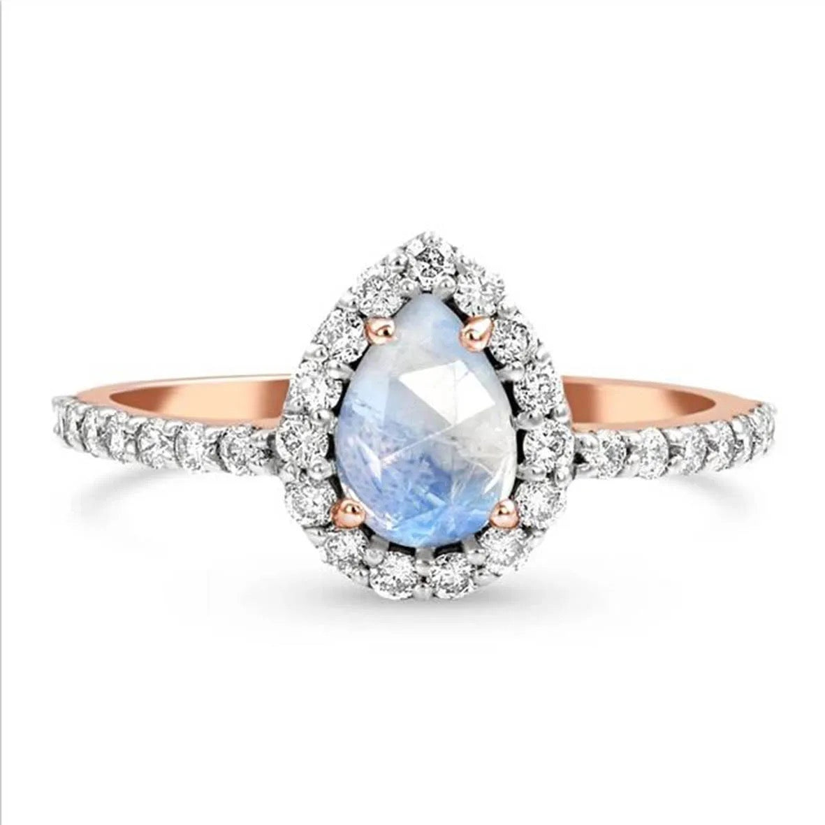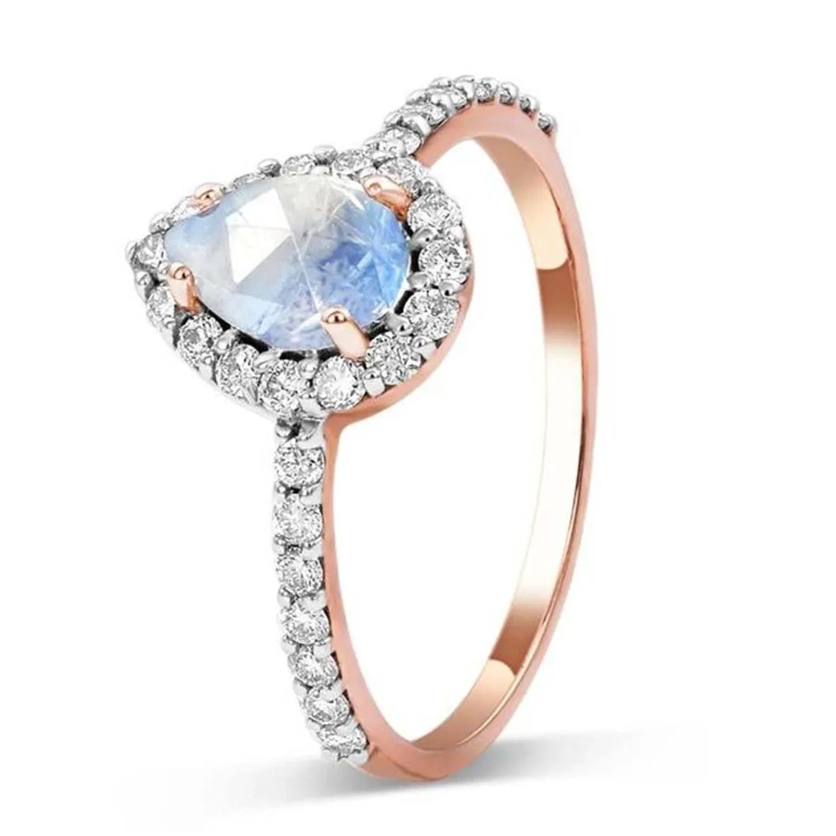 Cherish your love with our elegant Moonstone Ring With zircon - Nicole, an iridescent, genuine grade AAA Rainbow Moonstone surrounded by a sea of 29 sustainably zircon. The perfect piece to remember this moment, forever.
