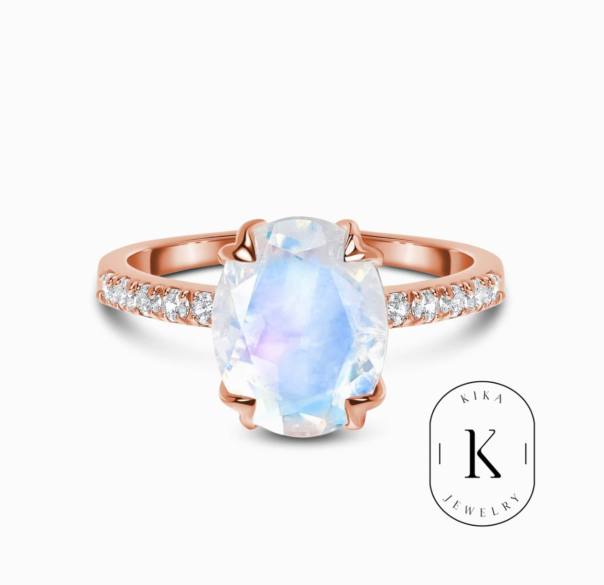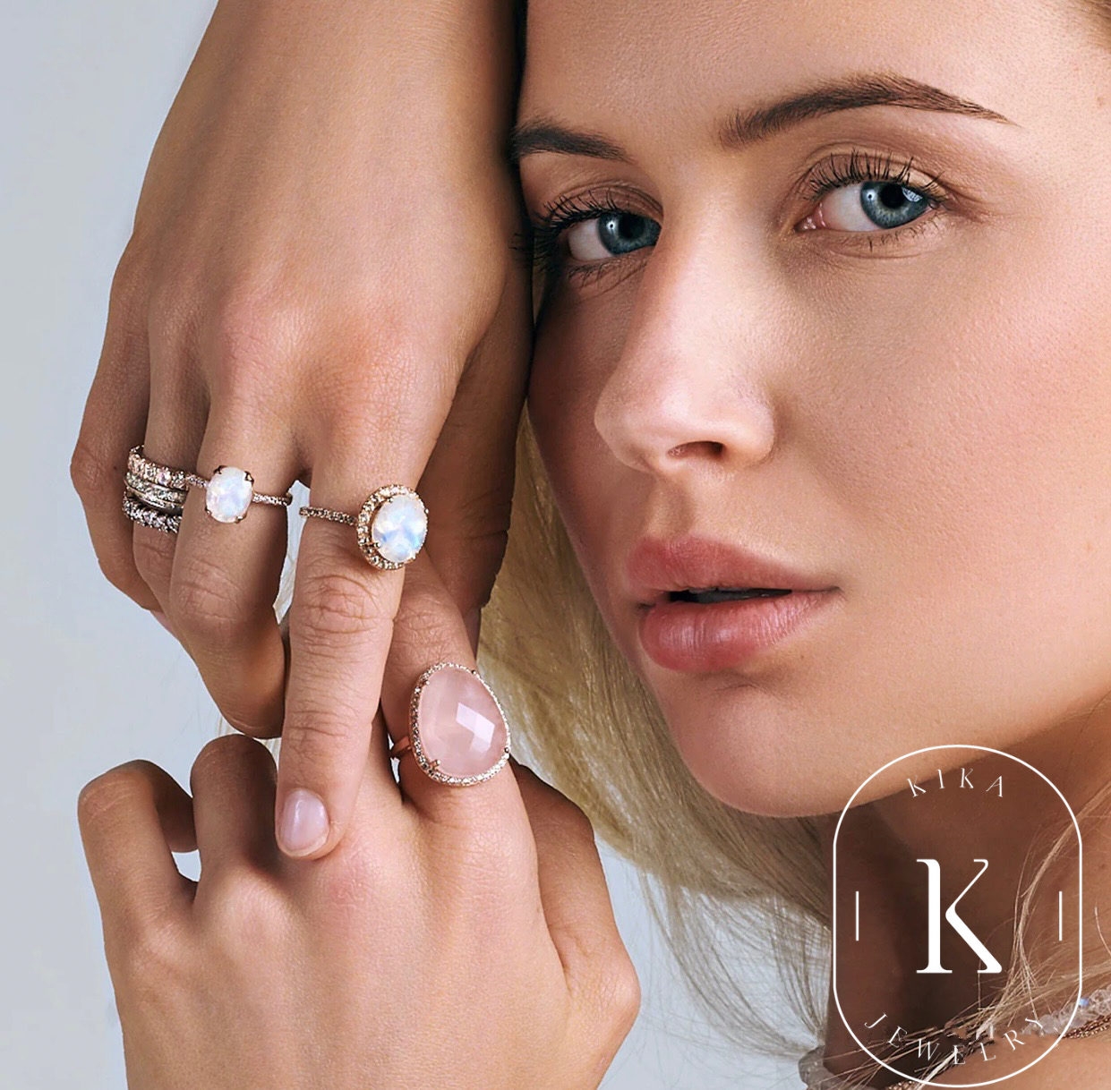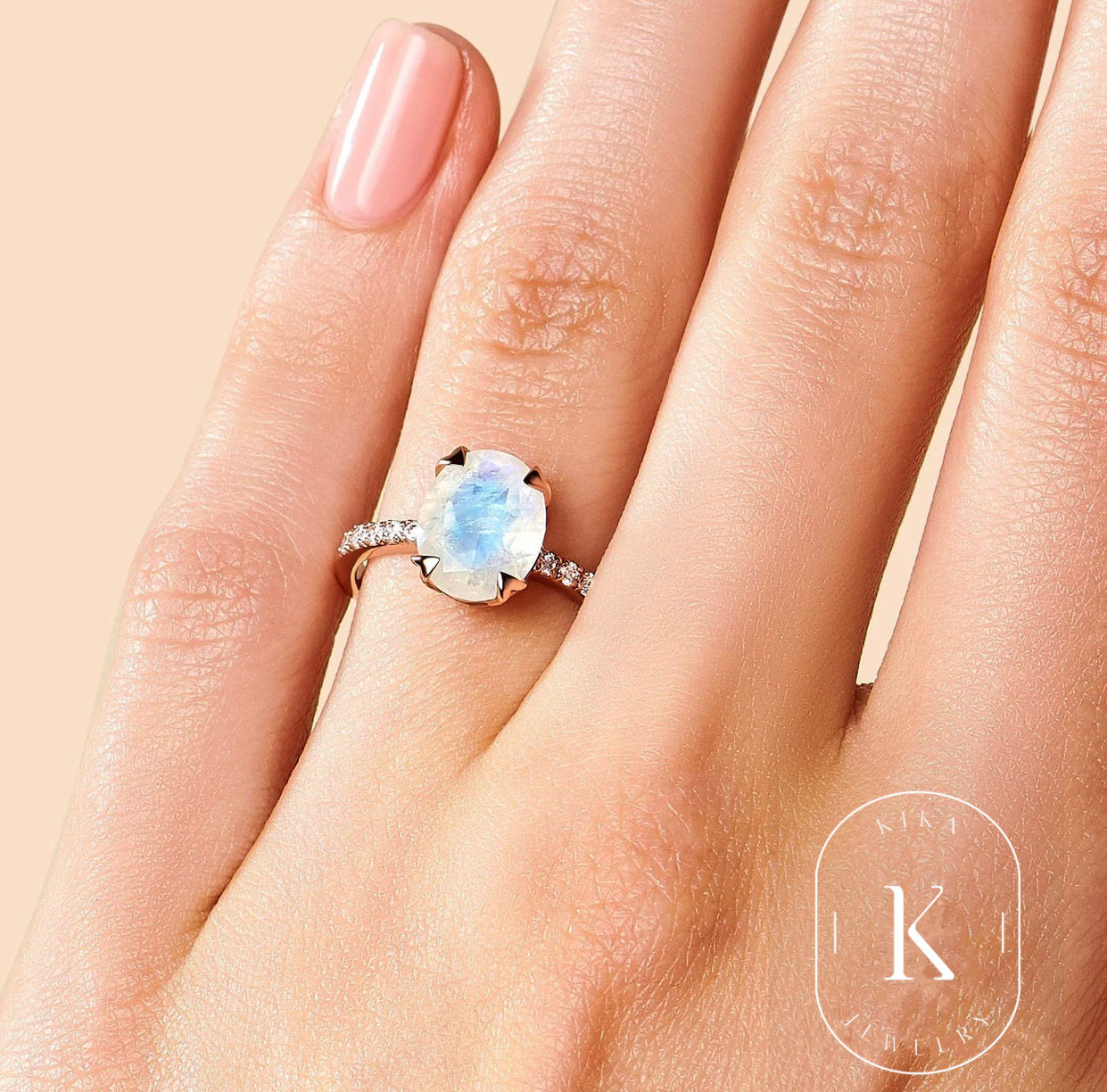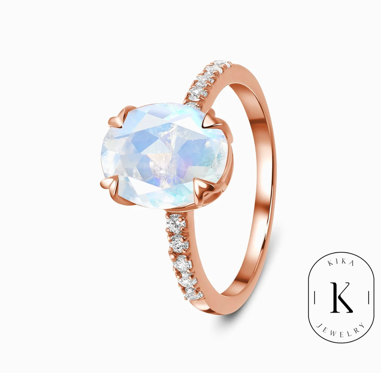 Nuestro elegante anillo de piedra lunar más vendido de todos los tiempos - Thiago destaca nuestra auténtica gema de piedra lunar engastada en una brillante y real banda de anillo adornada con zircon blanco.