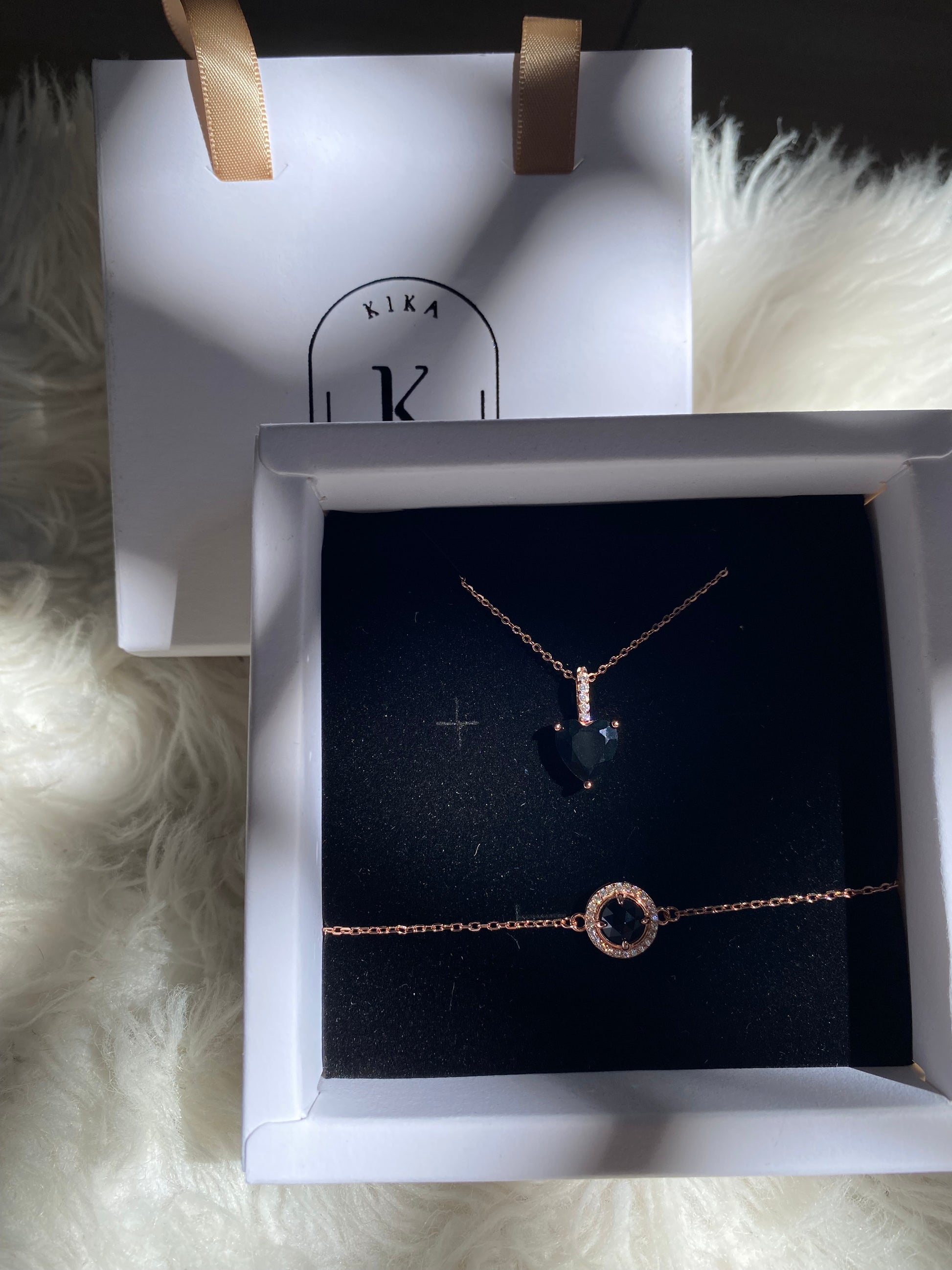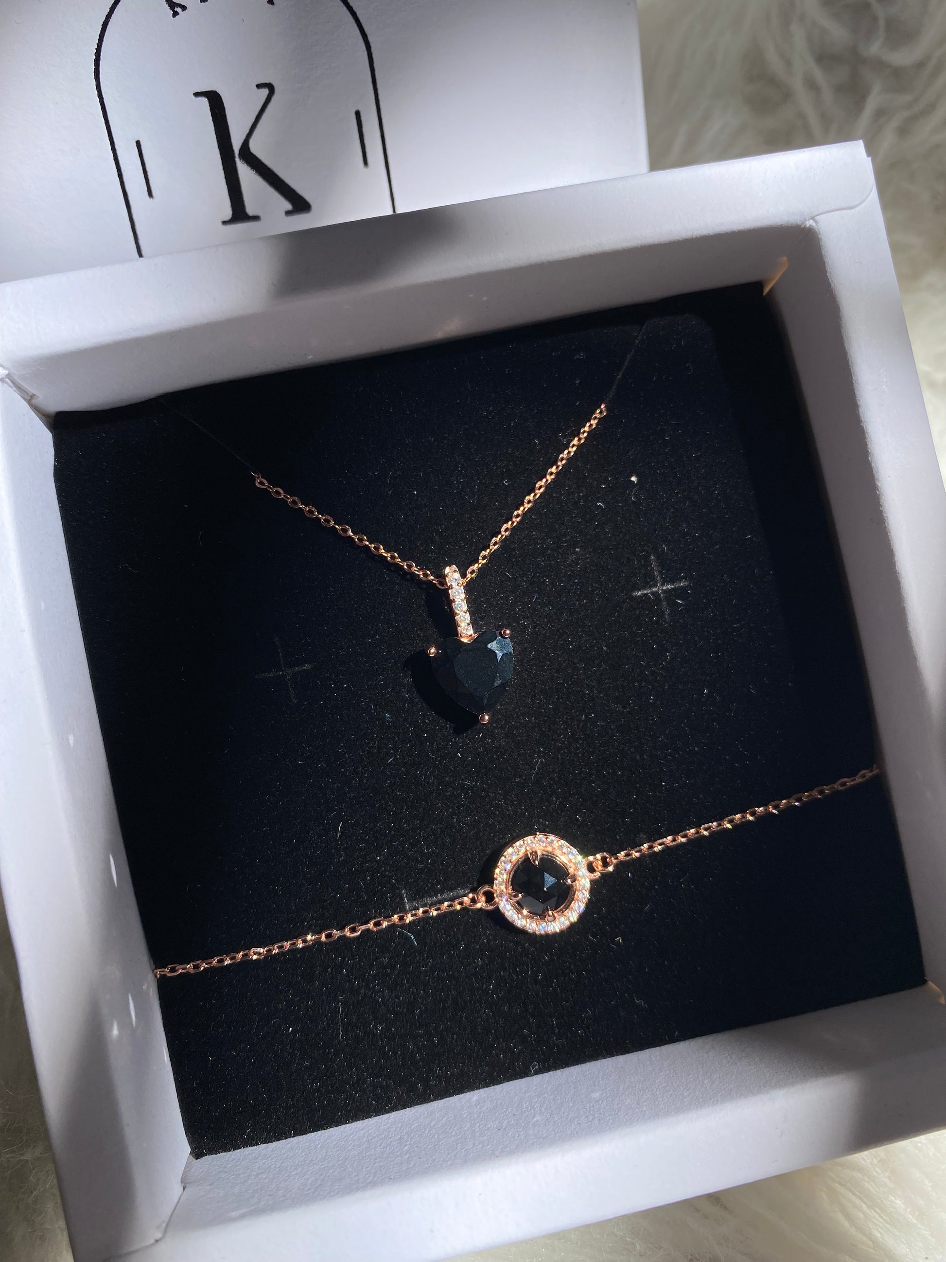 Embrace elegance with our Obsidian Heart Set. Featuring a stunning necklace with a natural black obsidian heart surrounded by sparkling zirconias, and a matching bracelet with round obsidian and delicate zirconia accents, all crafted in 925 sterling silver plated in rose gold.