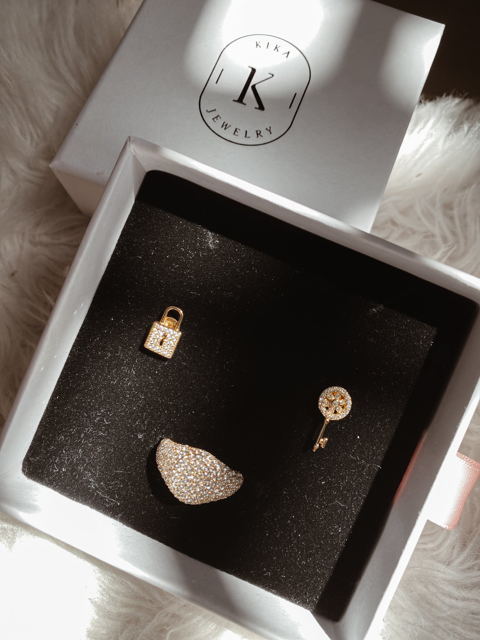 Desbloquea un mundo de elegancia con nuestro encantador Key to My Heart Set. Incluye delicados aretitos de candado y llave, combinados con un anillo resplandeciente lleno de pequeñas zirconias, el símbolo perfecto de amor, misterio y un brillo que perdura.