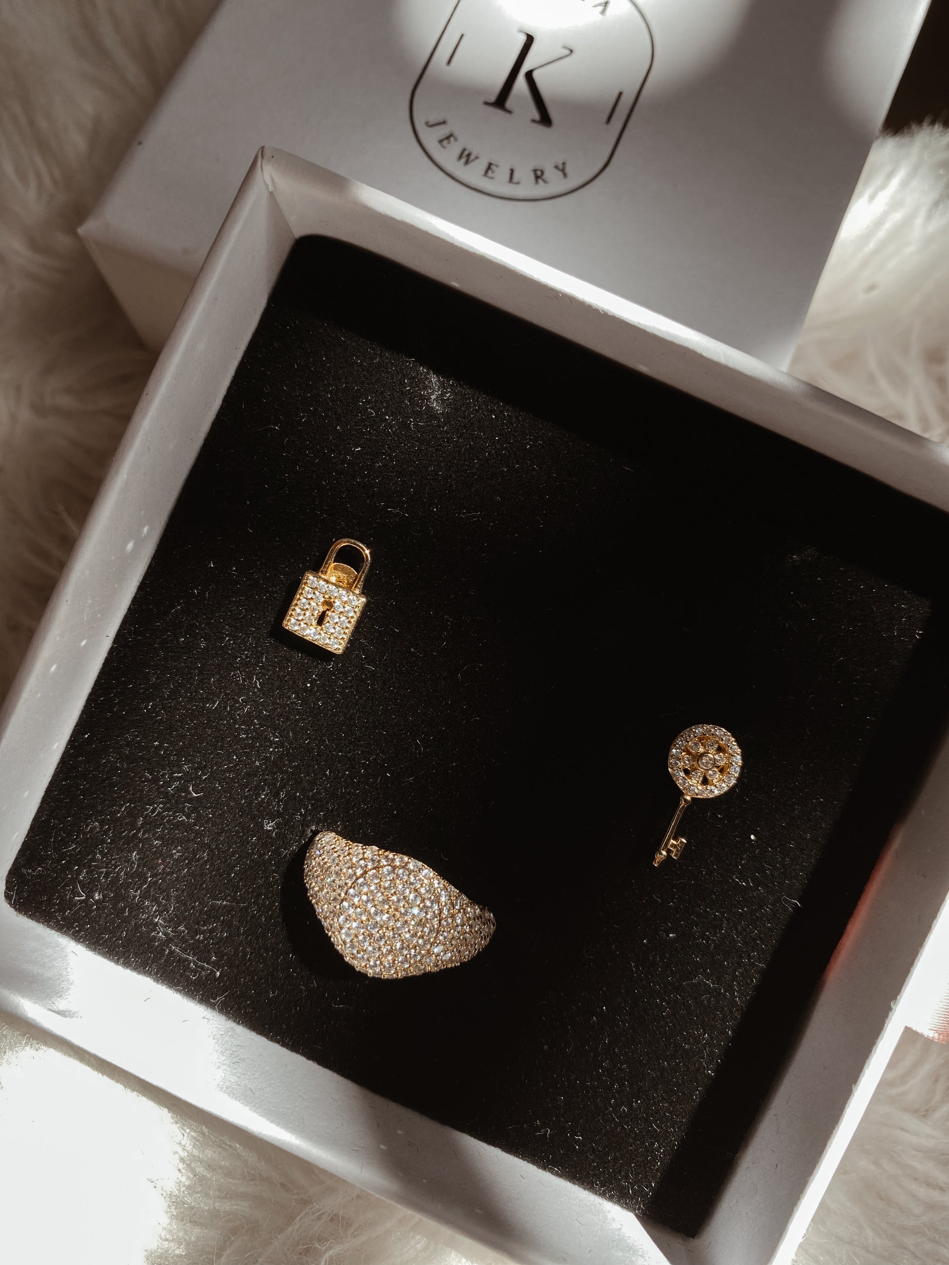 Unlock a world of elegance with our charming Key to My Heart Set. Featuring delicate lock and key earrings paired with a shimmering ring encrusted with tiny zirconias, this set is a perfect symbol of love, mystery, and everlasting sparkle.