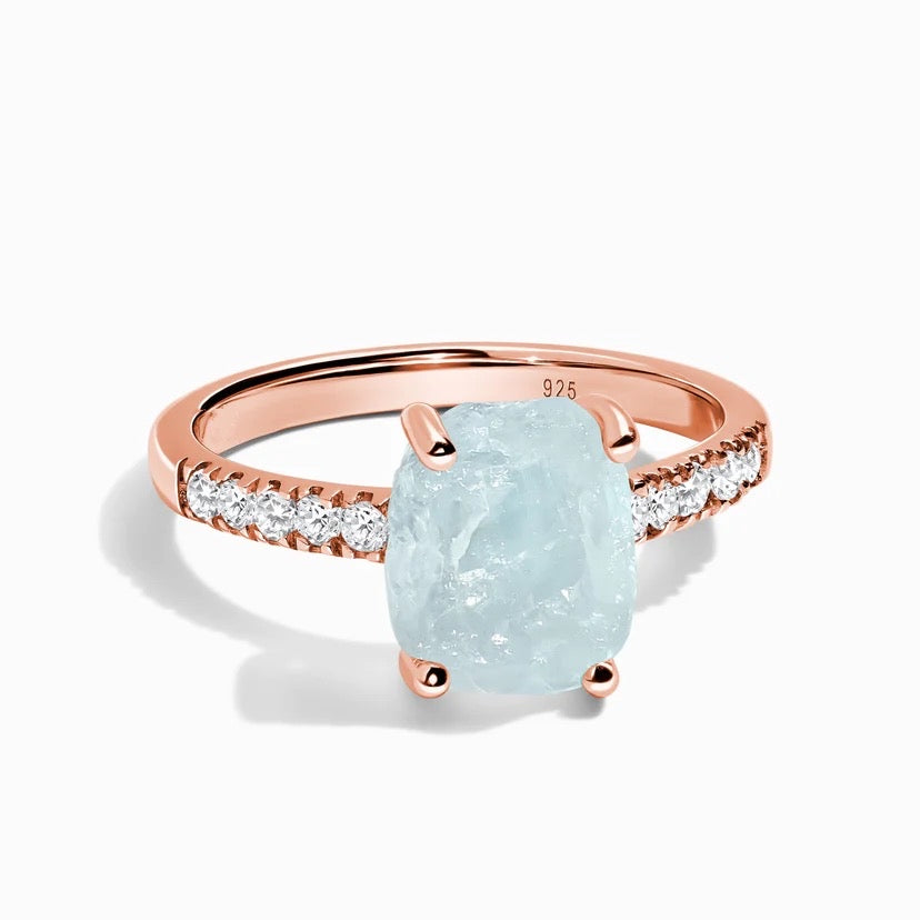 Make waves with this modernly icy combination. Our authentic Moon Magic Raw Crystal Ring- Ola Aquamarine garners attention with its perfectly imperfect blue stone while surrounded by a row of striking White Zircon.