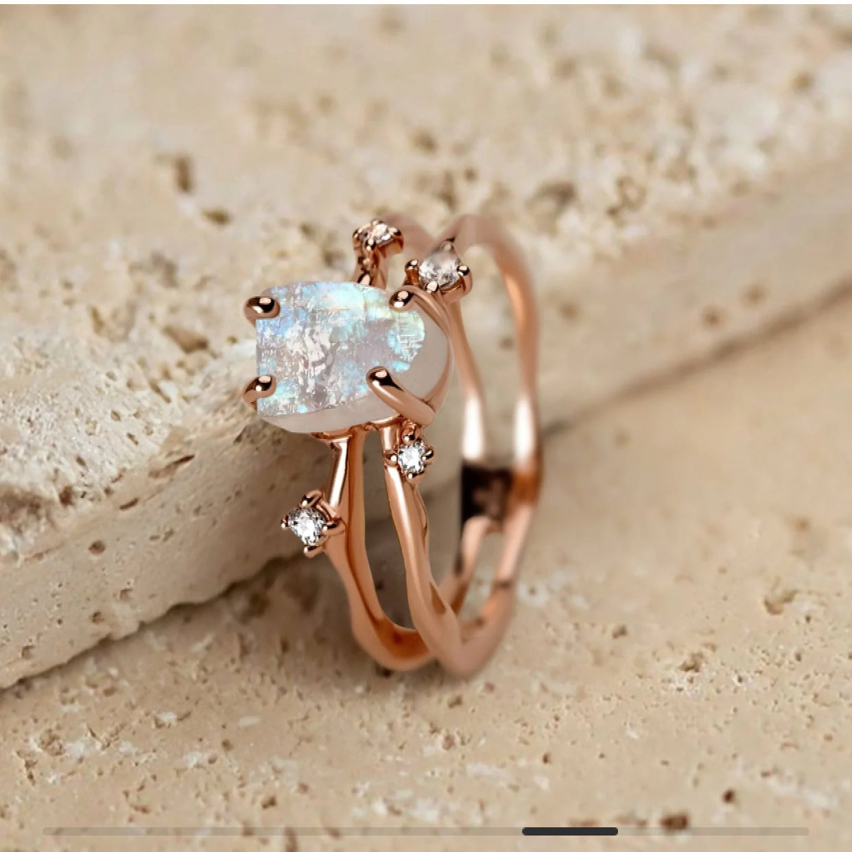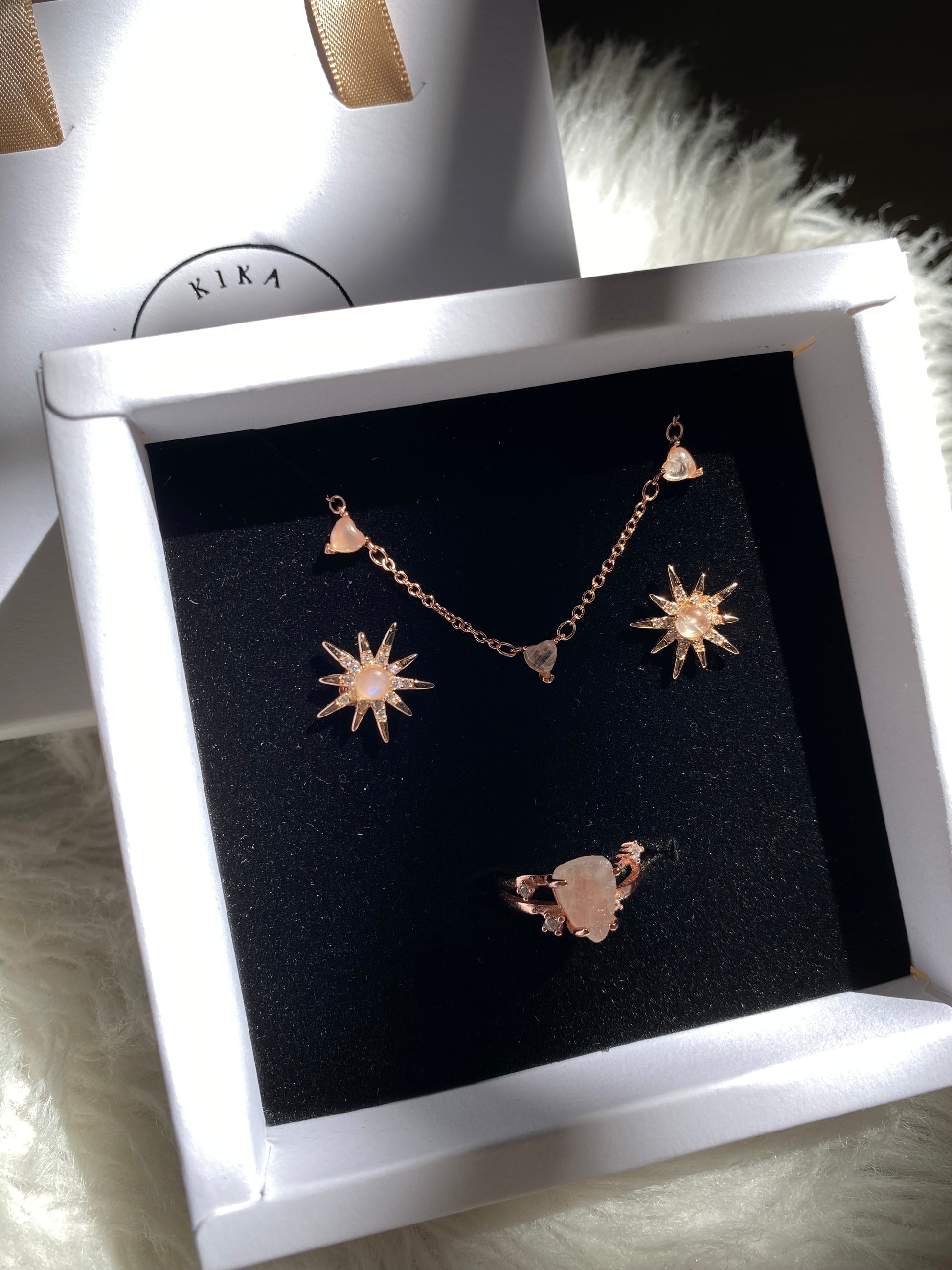Our Star of Love set shines with light and sweetness in every detail. Featuring a necklace, mornig star earrings, and a natural stone ring, this collection is perfect for gifting love. Finished in rose gold with sparkling accents that highlight the unique beauty of each piece.